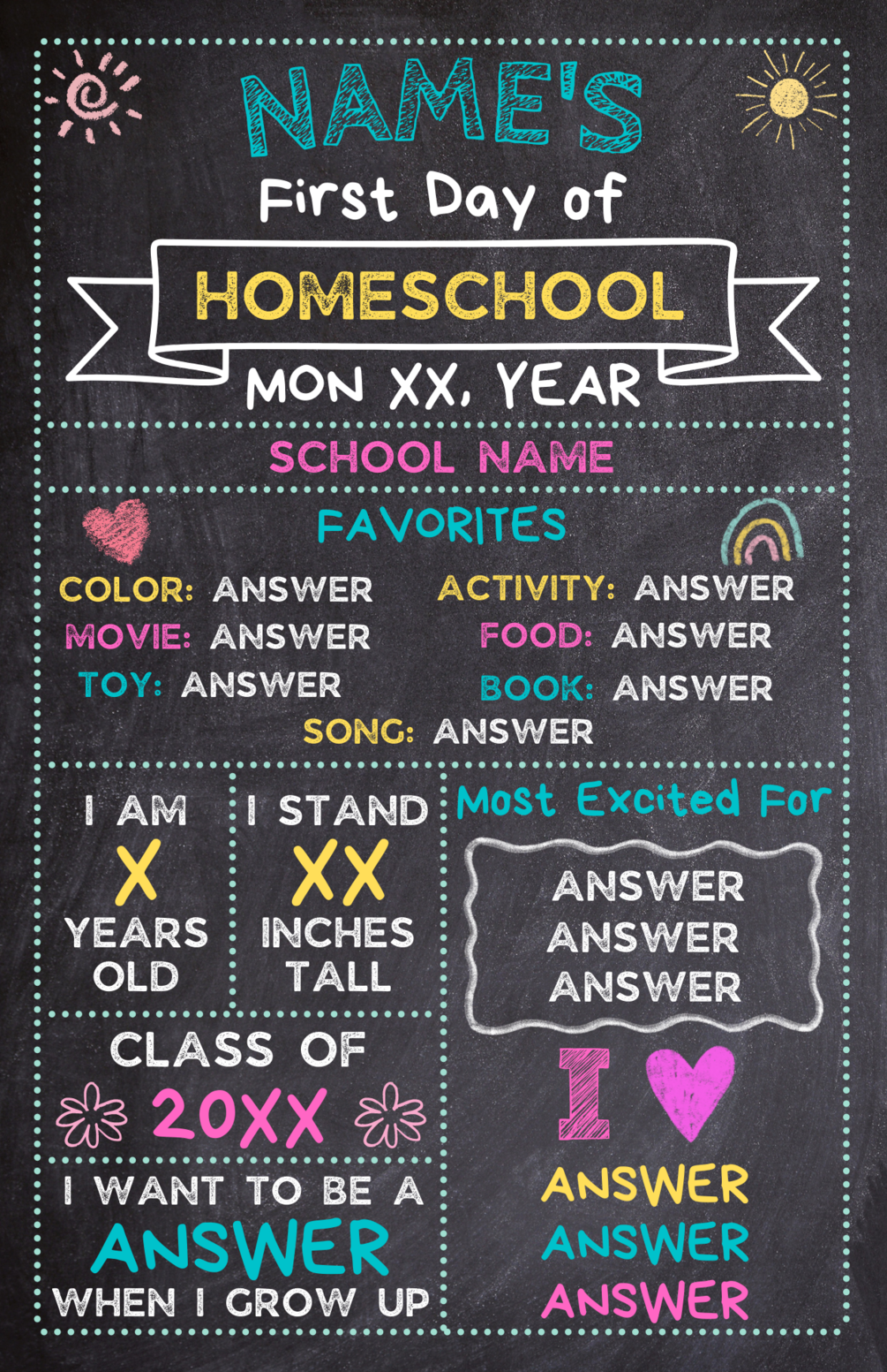 A Canva template to create your own First Day of Homeschool sign. All fields are editable. It can then be downloaded and printed at your local copy store!